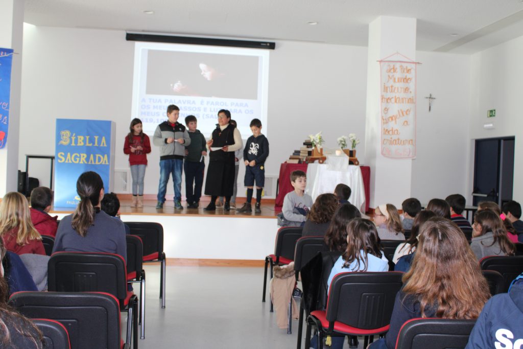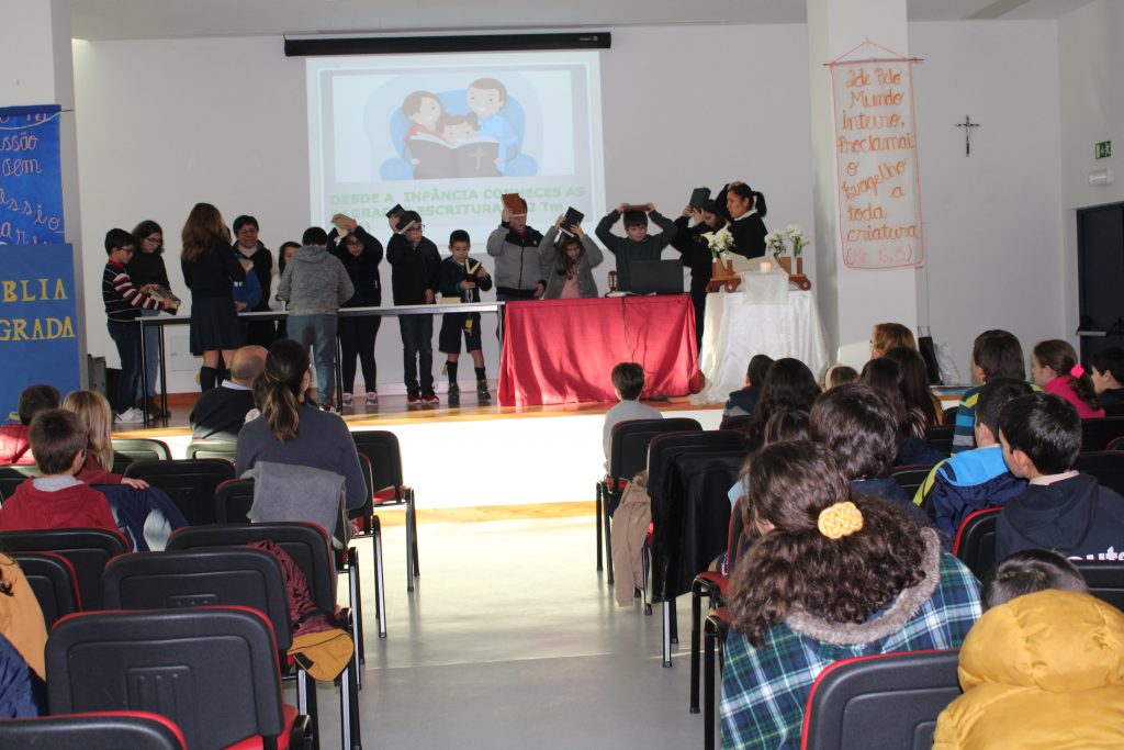 No dia 25 de Fevereiro na paróquia de Torres Vedras os grupos de catequeses do quarto ano, tiveram a preparação para a festa da palavra. Onde tivemos a oportunidade de partilhar o nosso carisma com eles, entre as atividades fizemos: A entronização da bíblia, também tivemos uma dinâmica titulada “Entrevista da bíblia”. Como é esta dinâmica? É uma bíblia muito grande onde pode entrar uma pessoa lá dentro. Os meninos tinham que fazer perguntas à bíblia e bíblia respondia às suas questões.